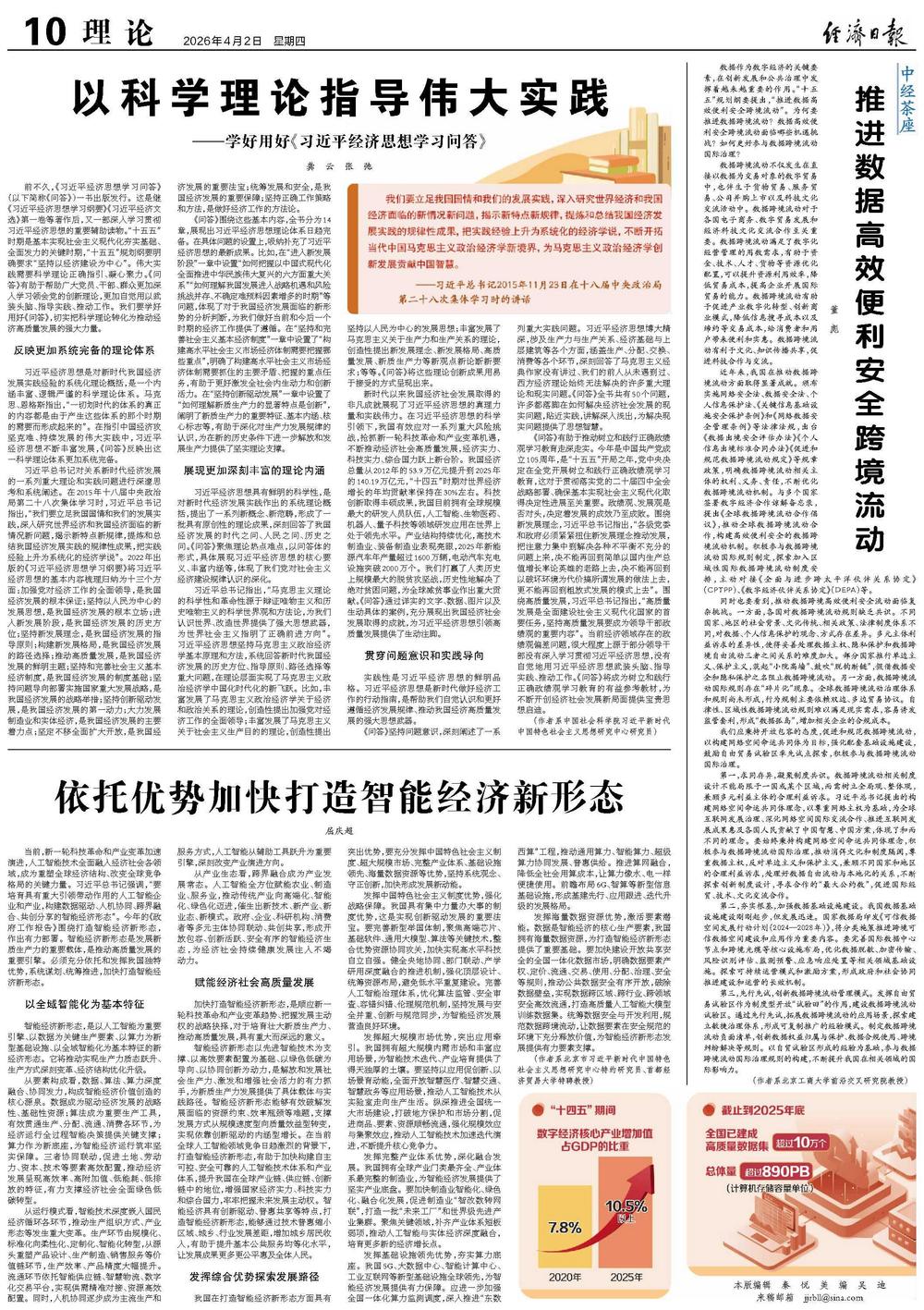 前不久,《习近平经济思想学习问答》(以下简称《问答》)一书出版发行。这是继《习近平经济思想学习纲要》《习近平经济文选》第一卷等著作后,又一部深入学习贯彻习近平经济思想的重要辅助读物。“十五五”时期是基本实现社会主义现代化夯实基础、全面发力的关键时期,“十五五”规划纲要明确要求“坚持以经济建设为中心”。伟大实践需要科学理论正确指引、凝心聚力。《问答》有助于帮助广大党员、干部、群众更加深入学习领会党的创新理论,更加自觉用以武装头脑、指导实践、推动工作。我们要学好用好《问答》,切实把科学理论转化为推动经济高质量发展的强大力量。