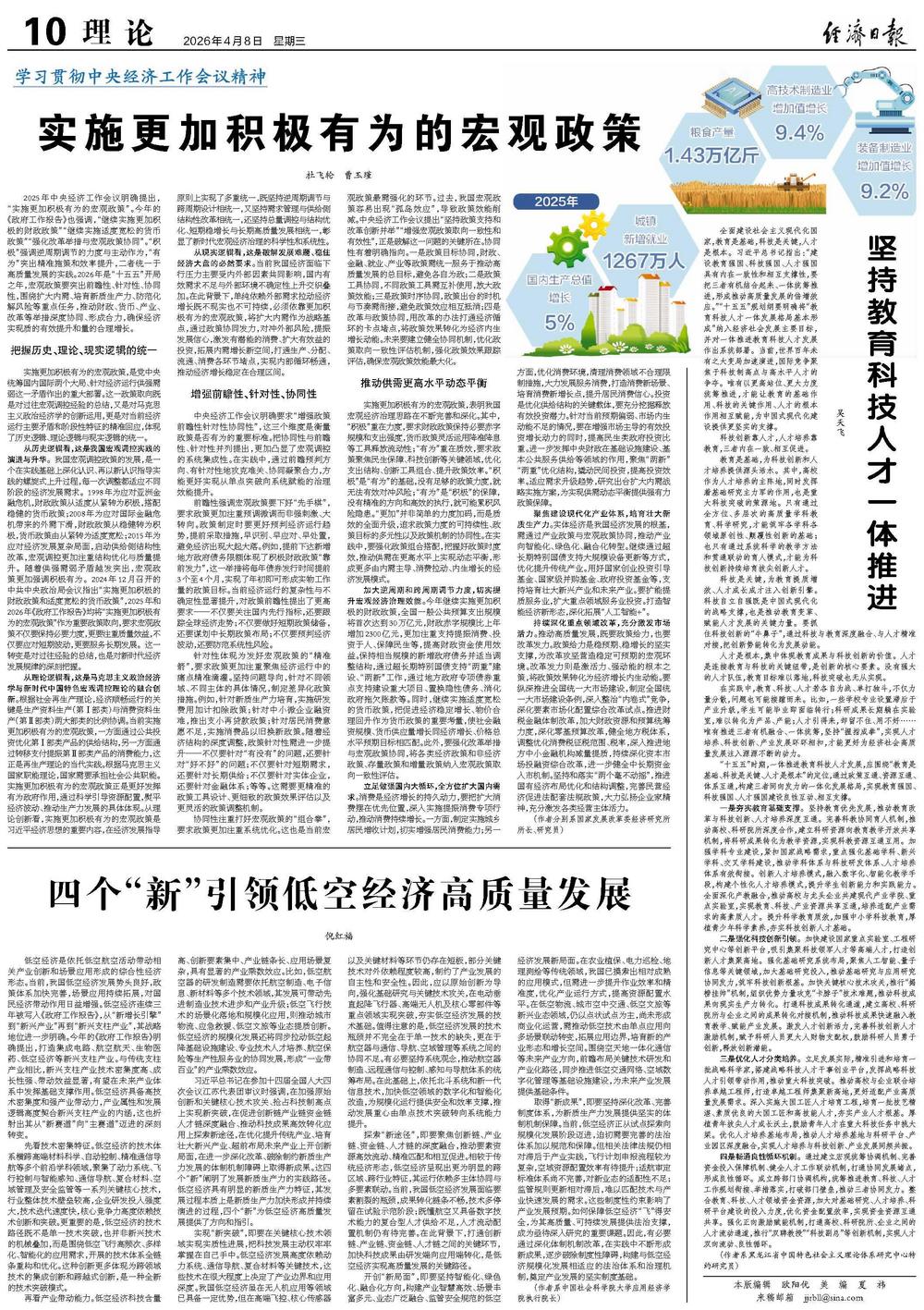 低空经济是依托低空航空活动带动相关产业创新和场景应用形成的综合性经济形态。当前,我国低空经济发展势头良好,政策体系加快完善,场景应用持续拓展,对国民经济带动作用日益增强。低空经济连续三年被写入《政府工作报告》,从“新增长引擎”到“新兴产业”再到“新兴支柱产业”,其战略地位进一步明确。今年的《政府工作报告》明确提出,打造集成电路、航空航天、生物医药、低空经济等新兴支柱产业。与传统支柱产业相比,新兴支柱产业技术密集度高、成长性强、带动效益显著,有望在未来产业体系中发挥基础支撑作用。低空经济具备高技术密集度和强产业带动力,产业属性和发展逻辑高度契合新兴支柱产业的内涵,这也折射出其从“新赛道”向“主赛道”迈进的深刻转变。